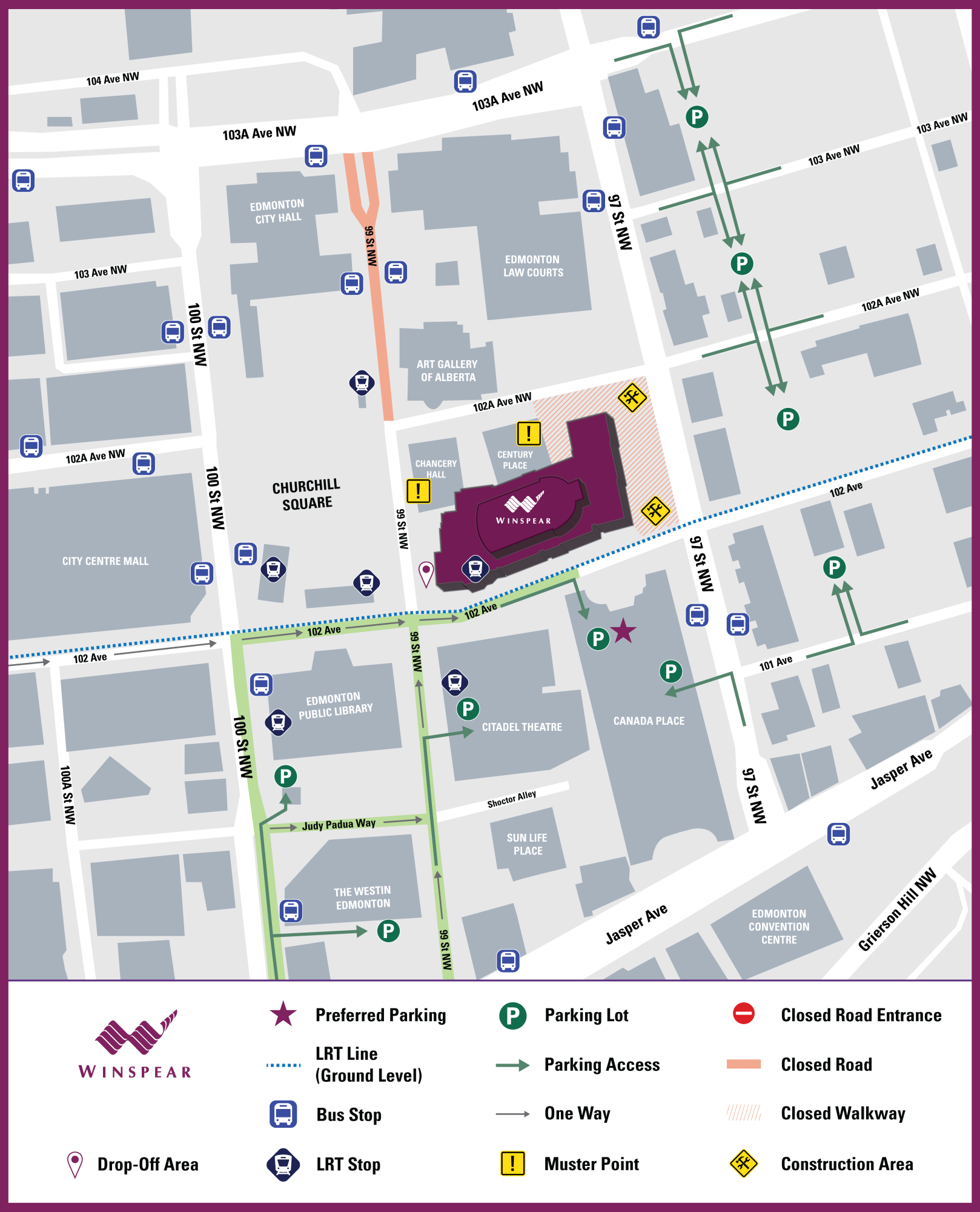 Library Parkade is located under the Citadel Theatre and provides pedway connections to the Winspear Centre. Please note that some Library Parkade exits may be under maintenance. Please check the City of Edmonton’s website for updates.